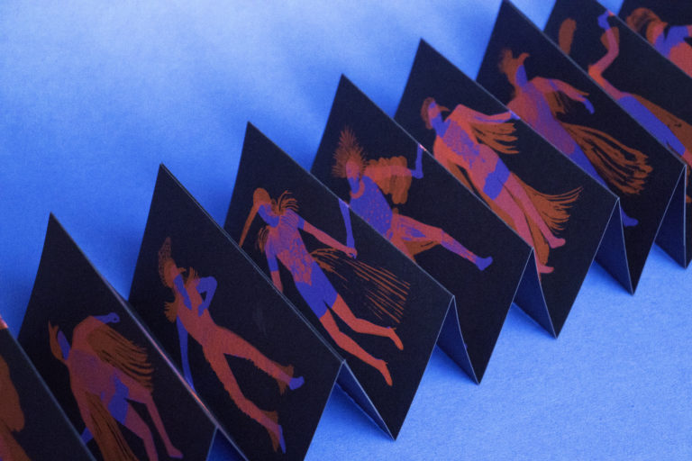 des silhouettes d’oiseaux de l’artiste, ils inventeront de somptueux costumes en papier découpé, puis imprimeront leurs pages en risographie, une technique d’impression semi-artisanale utilisée en édition d’art.